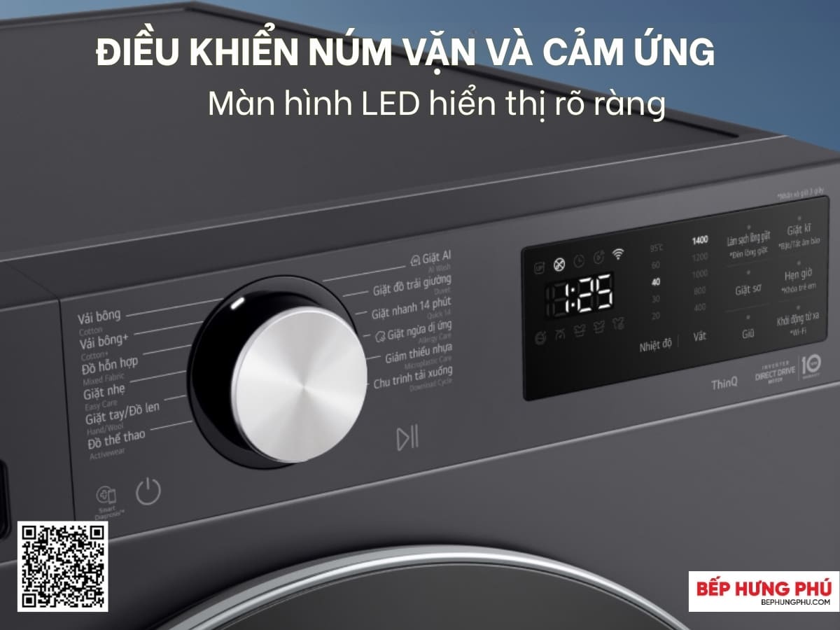 Máy giặt LG FX1412N5G được trang bị giao diện người dùng thông minh với bảng điều khiển kết hợp nút xoay và cảm ứng hiện đại. Người sử dụng dễ dàng chọn chương trình chỉ bằng cách xoay núm hoặc chạm nhẹ lên màn hình cảm ứng. Bên cạnh đó, thông tin quan trọng như thời gian còn lại, nhiệt độ nước được hiển thị rõ ràng trên màn hình LED lớn để người dùng theo dõi quá trình giặt thuận tiện.