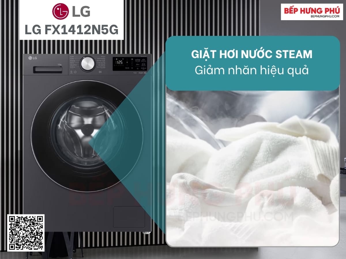 Máy giặt LG FX1412N5G tích hợp thêm công nghệ giặt hơi nước Steam tiên tiến. Cụ thể, trong quá trình giặt, máy sẽ phun hơi nước nóng ngay trong lồng để khử trùng và loại bỏ nhiều loại vi khuẩn gây hại tốt hơn so với chỉ sử dụng nước thông thường. Công nghệ này giúp mang lại quần áo sạch hơn, thơm hơn, đồng thời làm mềm vải và giảm nhăn hiệu quả.