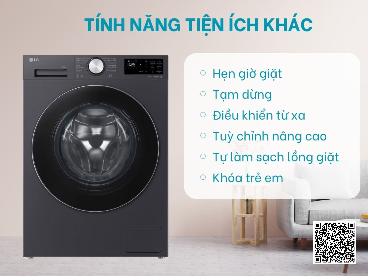 – Điều khiển từ xa: kết nối với thiết bị di động qua ứng dụng LG ThinQ, cho phép điều khiển máy giặt từ xa vô cùng tiện lợi.