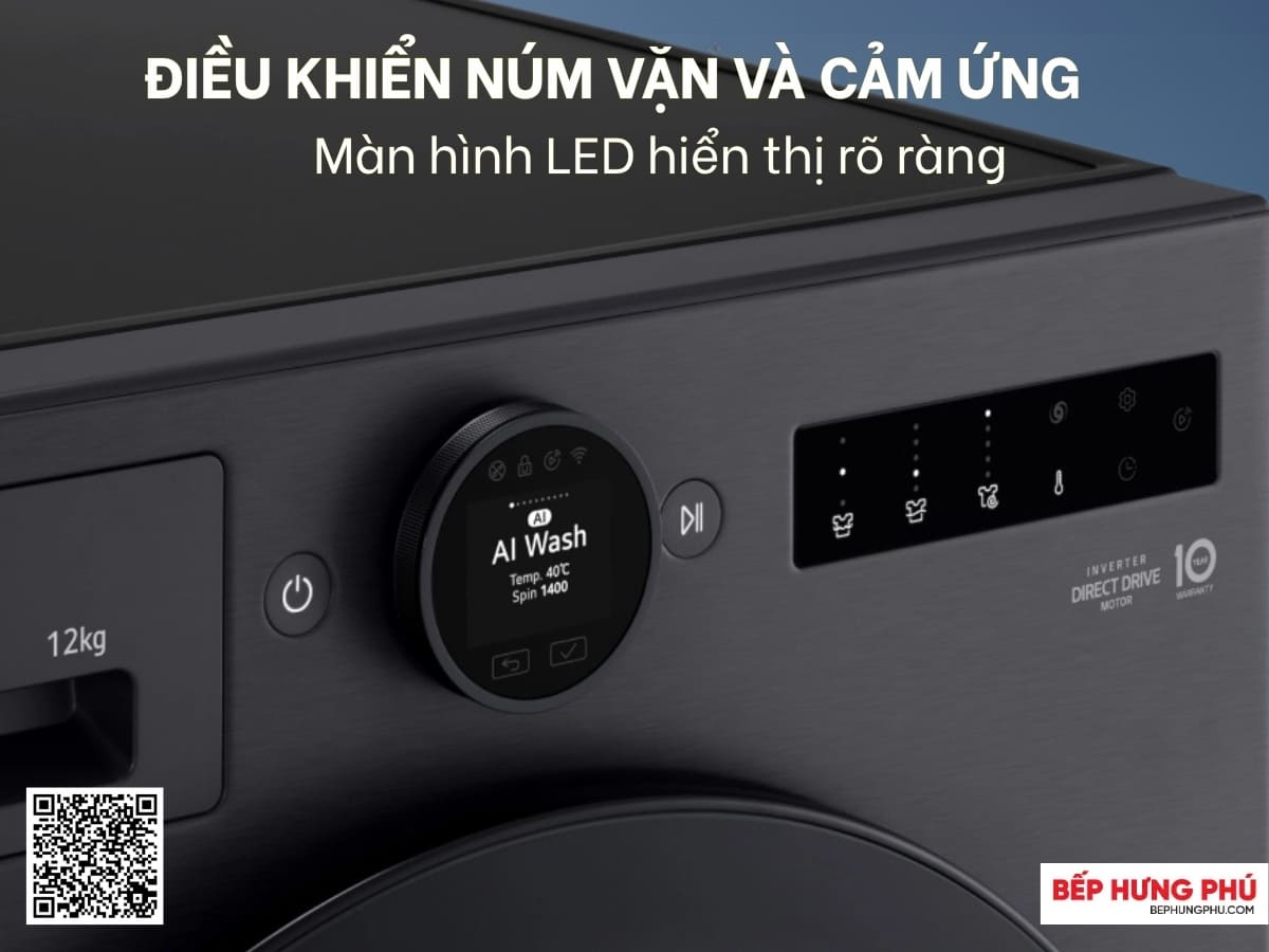 Máy giặt LG FX1412S3KAV được trang bị giao diện người dùng thông minh với bảng điều khiển song ngữ Anh – Việt, kết hợp giữa núm xoay, phím cảm ứng và màn hình hiển thị sắc nét, giúp thao tác dễ dàng. Bên cạnh đó, thông tin quan trọng như thời gian còn lại, nhiệt độ nước được hiển thị rõ ràng trên màn hình LED lớn để người dùng theo dõi quá trình giặt thuận tiện.