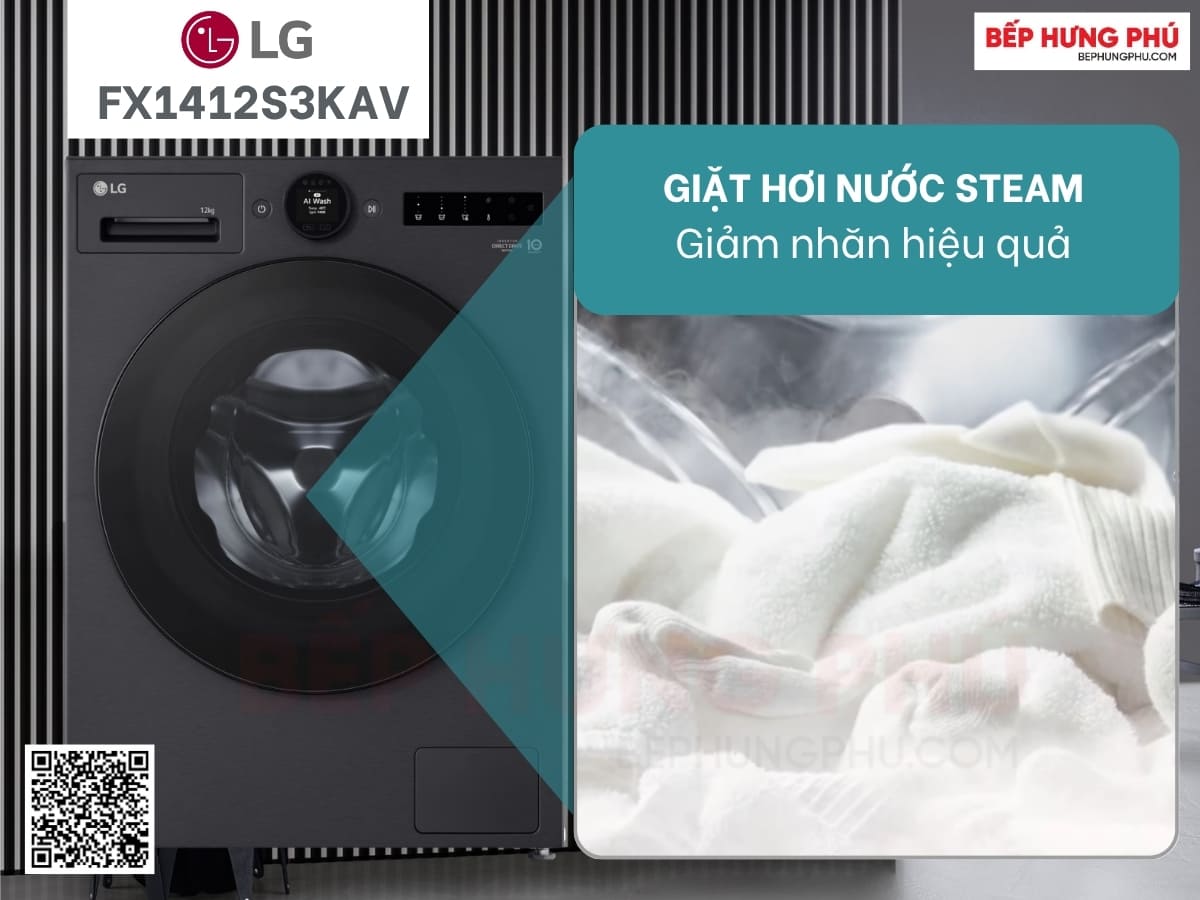 Máy giặt LG FX1412S3KAV tích hợp thêm công nghệ giặt hơi nước Steam tiên tiến. Công nghệ này giúp loại bỏ đến 99,9% vi khuẩn và các tác nhân gây dị ứng bám trên sợi vải. Hơi nước nóng còn giúp làm mềm vải và giảm các nếp nhăn hiệu quả, tiết kiệm thời gian là ủi sau khi giặt.
