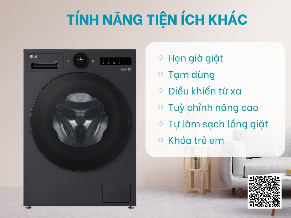 – Điều khiển từ xa: kết nối với thiết bị di động qua ứng dụng LG ThinQ, cho phép điều khiển máy giặt từ xa vô cùng tiện lợi.