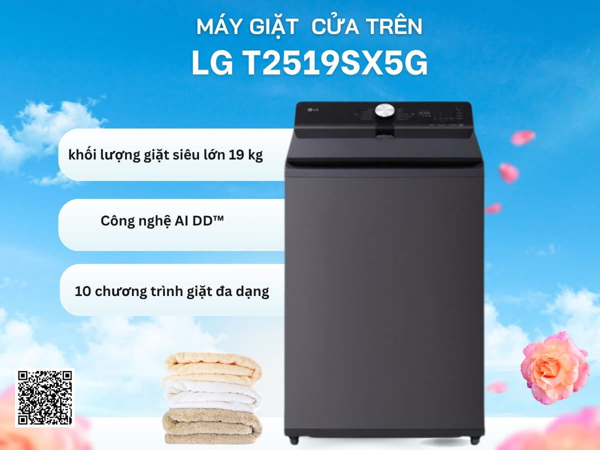 Máy giặt LG T2519SX5G với khối lượng giặt lớn 19 kg là sự lựa chọn lý tưởng cho các gia đình đông thành viên. Sản phẩm nổi bật với thiết kế cửa trên hiện đại, tích hợp hàng loạt công nghệ tiên tiến như giặt hơi nước Steam™ giúp diệt khuẩn và tác nhân gây dị ứng, TurboWash™ giúp giặt nhanh mạnh mẽ và công nghệ AI DD™ bảo vệ sợi vải tối ưu. Bên cạnh đó, máy còn được trang bị động cơ Inverter tiết kiệm điện và khả năng điều khiển từ xa thông minh qua ứng dụng LG ThinQ, mang lại sự tiện nghi tối đa cho người dùng.