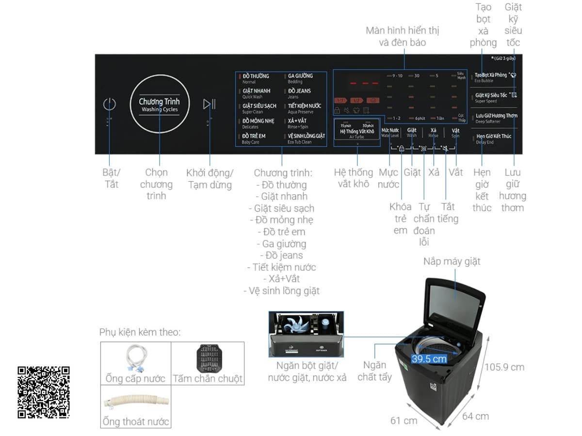 - Tự động vệ sinh lồng giặt Eco Tub Clean: Giúp vệ sinh lồng giặt tự động để loại bỏ các chất bẩn, vi khuẩn lâu ngày bám trên lồng giặt.