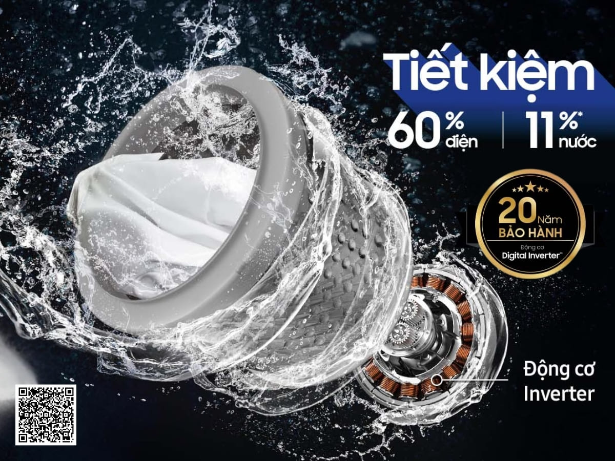 Máy giặt Samsung WA12CG5745BVSV sử dụng động cơ truyền động trực tiếp bền bỉ kết hợp công nghệ Digital Inverter, mang lại lợi ích kép giúp máy vận hành mượt mà, ít gây tiếng ồn và tiết kiệm điện năng hiệu quả (Hiệu suất sử dụng điện: 5.98 Wh/kg). Công nghệ chống rung ồn VRT Plus™ cũng góp phần tăng cường sự ổn định, bền bỉ cho máy.