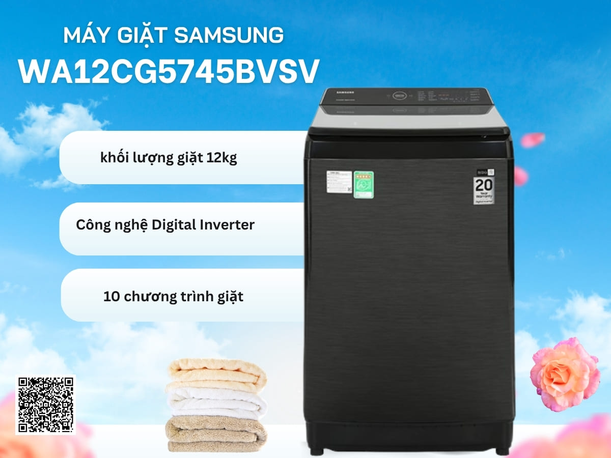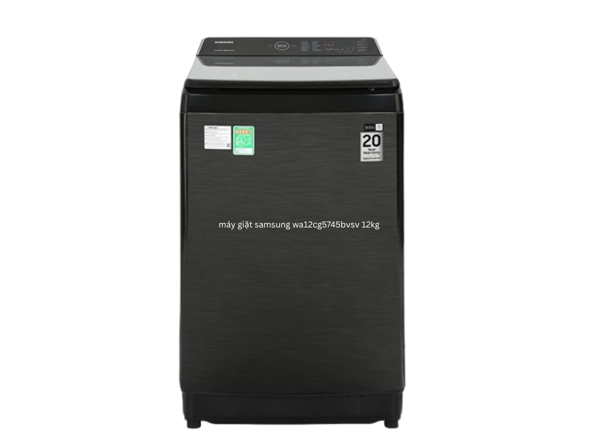 Máy giặt Samsung WA12CG5745BVSV thuộc dòng máy giặt cửa trên, lồng đứng với khối lượng giặt 12kg. Với sức chứa này, máy đáp ứng tốt nhu cầu giặt giũ của gia đình đông người (trên 7 thành viên), cho phép giặt được một lượng quần áo lớn trong mỗi lần giặt.