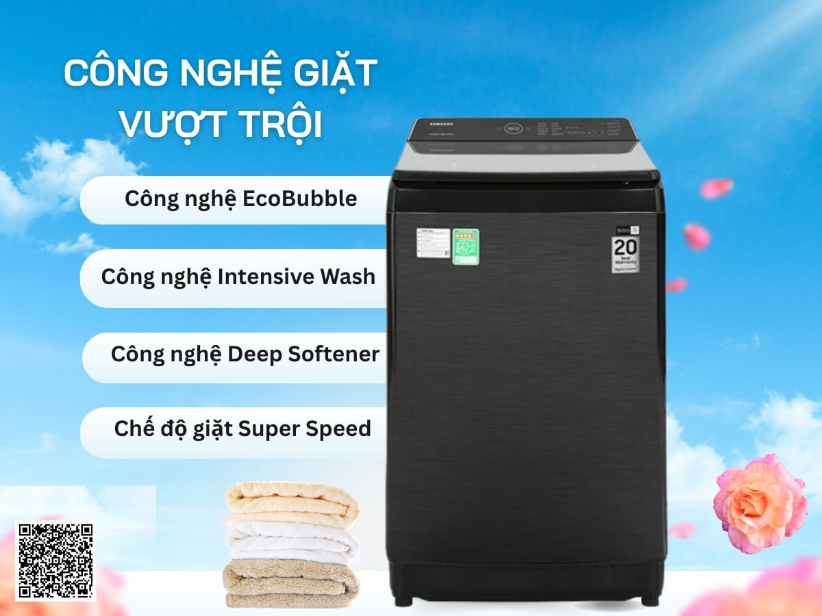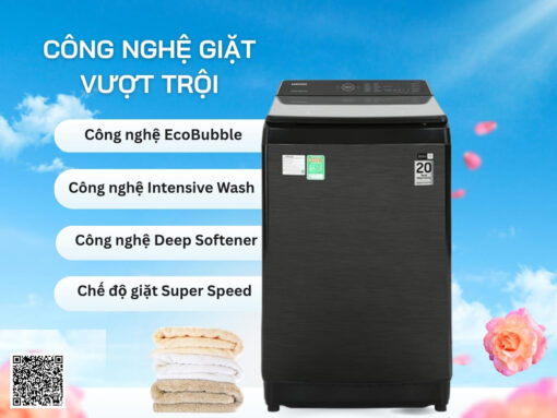 Đây là công nghệ giặt sạch sâu độc quyền của Samsung. Trên máy giặt Samsung WA12CG5745BVSV, trước khi chu trình giặt bắt đầu, công nghệ này sử dụng máy tạo bọt để hòa tan bột giặt với không khí và nước, tạo ra các bong bóng xà phòng siêu mịn. Các bong bóng này có khả năng thẩm thấu vào từng sợi vải nhanh hơn gấp 40 lần so với dung dịch giặt tẩy thông thường, giúp làm lỏng và loại bỏ các vết bẩn cứng đầu một cách hiệu quả. Đặc biệt, EcoBubble giặt sạch vượt trội ngay cả trong nước lạnh (lên đến 15°C), góp phần tiết kiệm đáng kể điện năng tiêu thụ và bảo vệ màu sắc cũng như chất liệu vải tốt hơn.