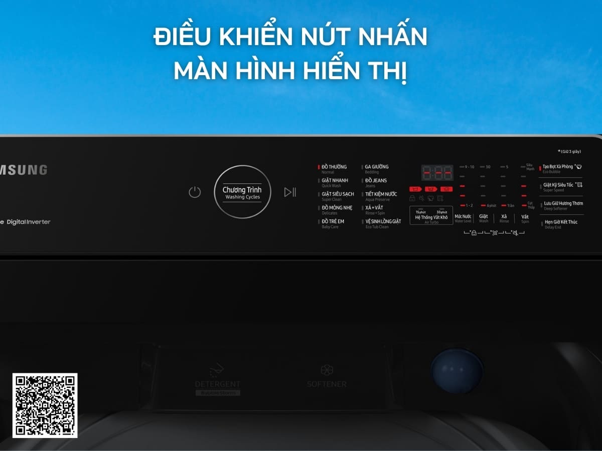 Máy giặt Samsung WA12CG5745BVSV thiết kế giao diện điều khiển dạng nút nhấn, có màn hình hiển thị rõ ràng. Đặc biệt là giao diện song ngữ Anh – Việt để thuận tiện sử dụng, thân thiện với mọi người dùng.
