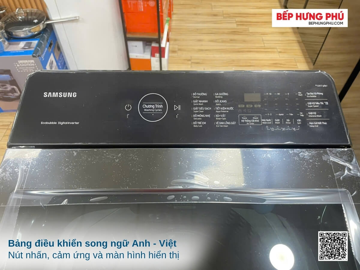 Máy giặt Samsung WA95CG4545BDSV sở hữu bảng điều khiển song ngữ Anh – Việt với màn hình hiển thị LED thân thiện, thiết kế nghiêng về phía sau giúp người dùng thao tác dễ dàng và thoải mái. Thiết kế này đồng thời ngăn nước tràn vào bề mặt điều khiển, đảm bảo an toàn và tăng độ bền cho máy giặt.