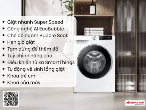 – Điều khiển từ xa SmartThings: kết nối với thiết bị di động qua ứng dụng SmartThings, cho phép theo dõi và điều khiển máy giặt từ xa vô cùng tiện lợi.