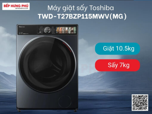Máy giặt sấy Toshiba TWD-T27BZP115MWV(MG) thiết kế cửa trước hiện đại, khối lượng giặt 10.5kg/ sấy 7kg