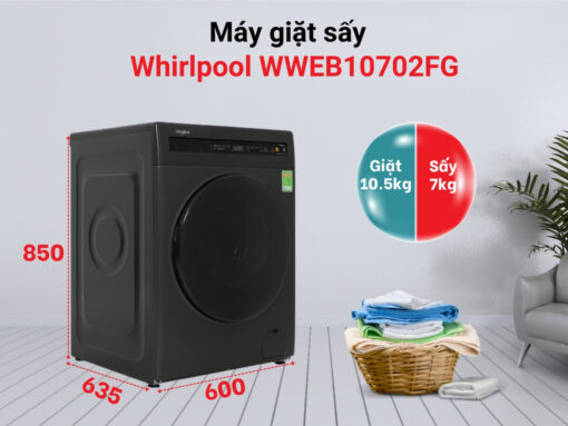 Máy giặt sấy Whirlpool WWEB10702FG thiết kế cửa trước hiện đại, khối lượng giặt 10.5kg và sấy 7kg