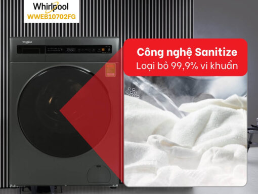 Máy giặt sấy Whirlpool WWEB10702FG được trang bị công nghệ giặt khử trùng Sanitize tiên tiến. Công nghệ này cho phép loại bỏ tới 99,9% vi khuẩn trên quần áo thông qua chu trình giặt ở nhiệt độ 40 độ C. Điều này giúp đảm bảo an toàn cho sức khoẻ người dùng, đặc biệt là trẻ em hay người có da nhạy cảm. Đồng thời, không giống phương pháp giặt thông thường ở nhiệt độ cao, quần áo vẫn được bảo toàn màu sắc, hình dáng sau quá trình giặt.