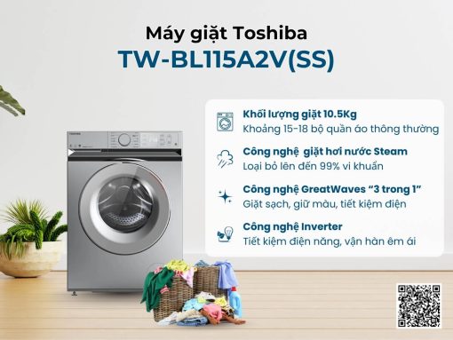 Máy giặt Toshiba TW-BL115A2V(SS) với thiết kế cửa trước hiện đại, khối lượng giặt 10.5kg. Trang bị công nghệ Steam giặt hơi nước diệt khuẩn 99%, GreatWaves “3 trong 1” giặt sạch, giữ màu và tiết kiệm điện. Công nghệ siêu bọt khí Nano (UFB) tăng hiệu quả làm sạch, cùng động cơ Inverter vận hành êm, tiết kiệm năng lượng.