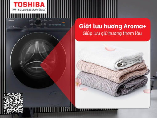 Máy giặt Toshiba TW-T21BU115UWV(MG) thiết kế cửa trước – lồng ngang với khối lượng giặt 10.5kg phù hợp với gia đình đông người. Máy được trang bị nhiều công nghệ tiên tiến như: giặt hơi nước GreatSteam giúp giặt sạch sâu và diệt khuẩn, giặt lưu hương Aroma+, công nghệ Siêu bọt khí nano UFB, công nghệ Color Alive bảo vệ vải, giảm phai màu, công nghệ Inverter tiết kiệm điện… 15 chương trình giặt đa dạng, đáp ứng đầy đủ nhu cầu giặt giũ của gia đình. Hệ thống điều khiển núm vặn kết hợp cảm ứng và màn hình hiển thị LED hiện đại, giao diện tiếng Anh – Việt dễ dàng sử dụng.