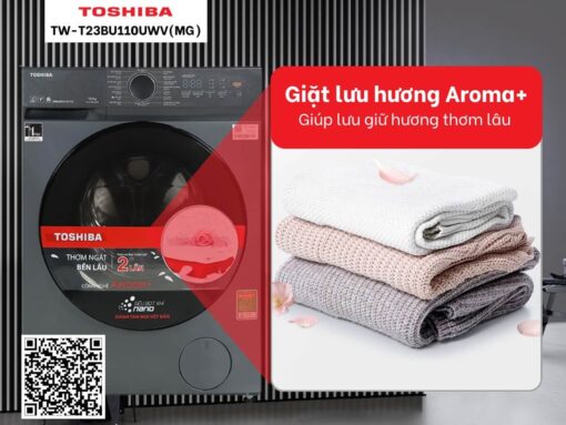 Máy giặt Toshiba TW-T23BU110UWV(MG) thiết kế cửa trước – lồng ngang với khối lượng giặt 10kg phù hợp với gia đình đông người. Máy được trang bị nhiều công nghệ tiên tiến như: giặt hơi nước GreatSteam giúp giặt sạch sâu và diệt khuẩn, giặt lưu hương Aroma+, công nghệ Siêu bọt khí nano UFB, công nghệ GreatWaves bảo vệ vải, giảm phai màu, công nghệ Inverter tiết kiệm điện… 12 chương trình giặt đa dạng, đáp ứng đầy đủ nhu cầu giặt giũ của gia đình. Hệ thống điều khiển núm vặn kết hợp cảm ứng và màn hình hiển thị LED hiện đại, giao diện tiếng Anh – Việt dễ dàng sử dụng.