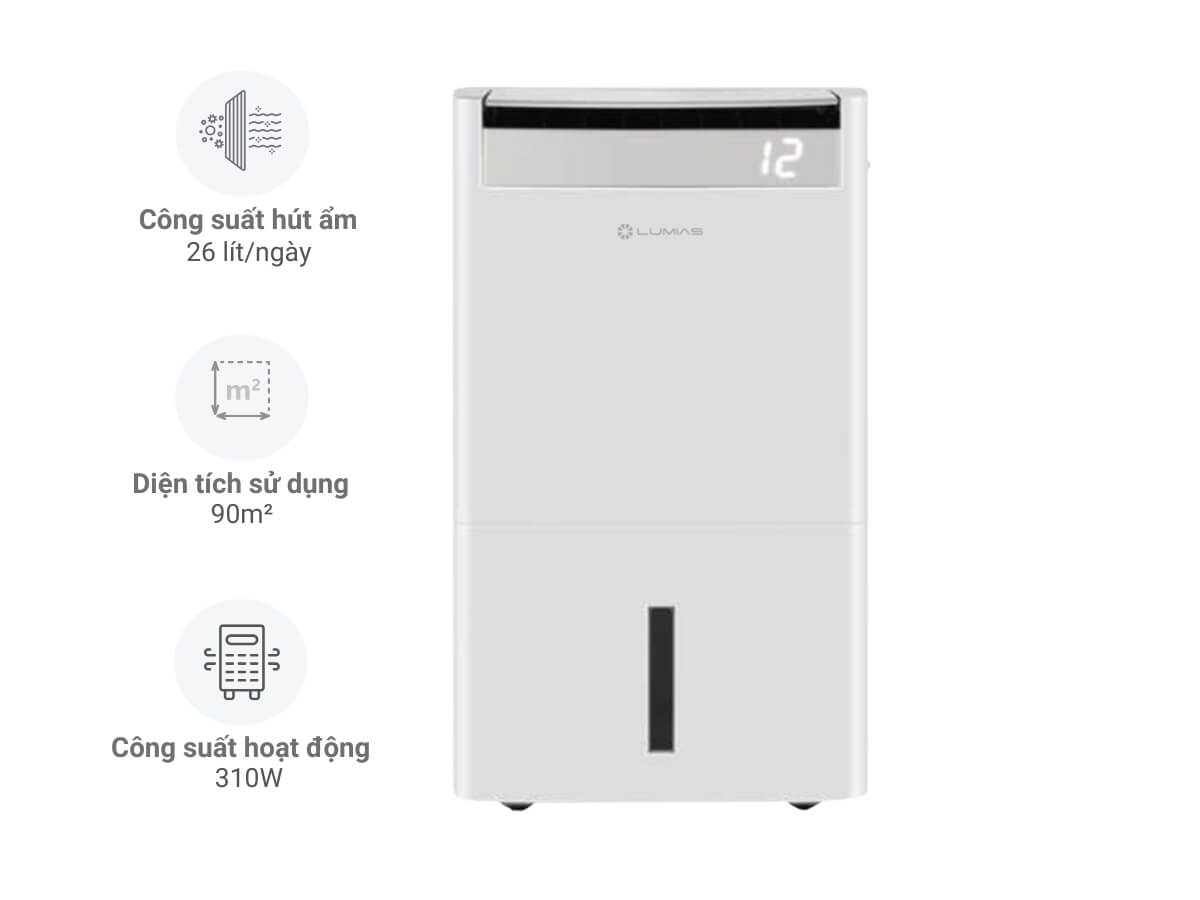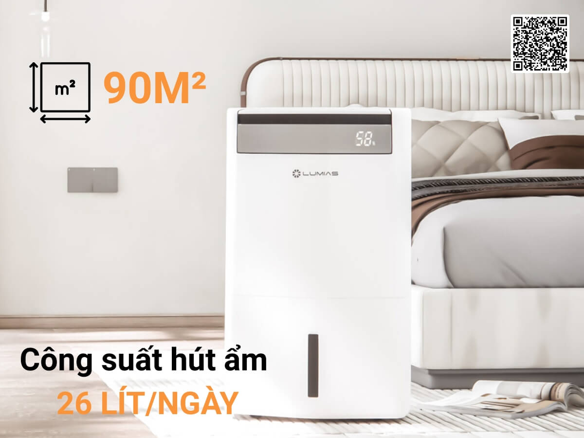 Công suất hút ẩm 26 lít/ngày, diện tích sử dụng 90m²