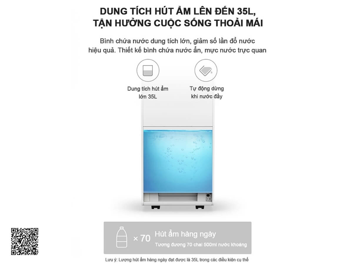 Công suất hút ẩm 35 lít/ngày, bình chứa nước 5.5 lít