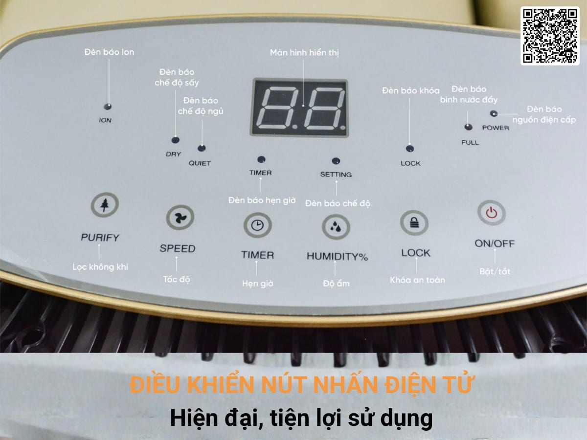 Máy hút ẩm Nanoco NDH102 thiết kế hệ thống bảng điều khiển cảm ứng và màn hình hiển thị. Các chức năng được ký hiệu rõ ràng, dễ hiểu và dễ điều khiển. Màn hình hiển thị sáng rõ, trực quan các thông tin hoạt động của máy, bao gồm cả báo độ ẩm, để bạn dễ dàng theo dõi và điều chỉnh. Máy cũng tích hợp các tính năng tiện ích như hẹn giờ (1-24h) và khóa trẻ em an toàn.