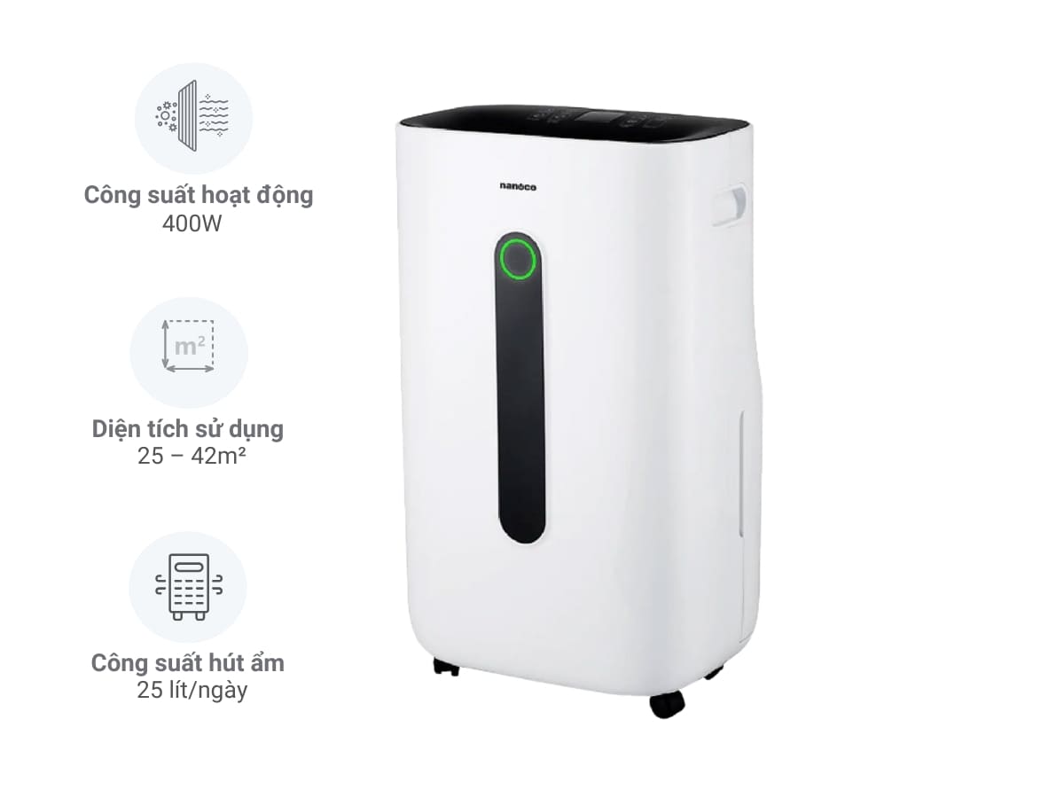 Máy hút ẩm Nanoco NDH256 có công suất hoạt động 400W cùng công suất hút ẩm 25 lít/ngày, cho khả năng hút ẩm nhanh chóng và hiệu quả, phù hợp sử dụng cho không gian với diện tích tối đa 25 – 42m². Với thiết kế nhỏ gọn cùng hiệu suất hút ẩm tối ưu, Nanoco NDH256 là lựa chọn lý tưởng dùng cho phòng khách, phòng ngủ gia đình.