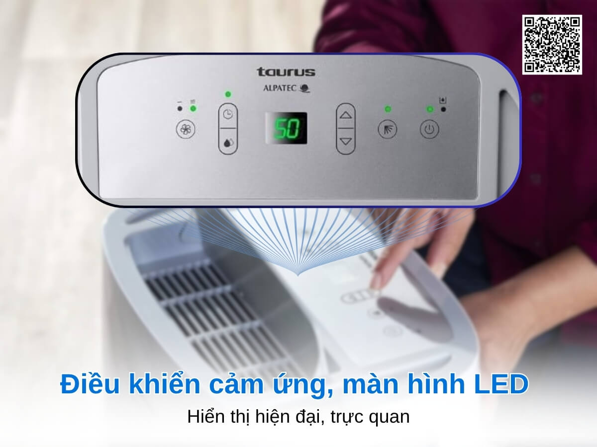Máy hút ẩm Taurus DH2201 được trang bị bảng điều khiển cảm ứng kết hợp màn hình LED hiển thị rõ ràng, cho phép người dùng dễ dàng theo dõi phần trăm độ ẩm không khí trong phòng và điều chỉnh mức hút ẩm phù hợp. Máy hỗ trợ 2 tốc độ hoạt động (cao/thấp), giúp tùy chỉnh linh hoạt theo nhu cầu sử dụng thực tế.