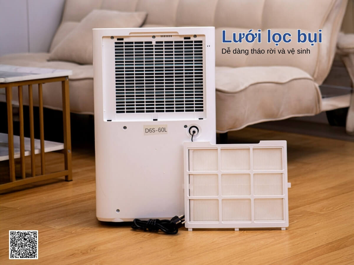 Công suất hút ẩm 60 lít/ngày, bình chứa nước 7,7 lít