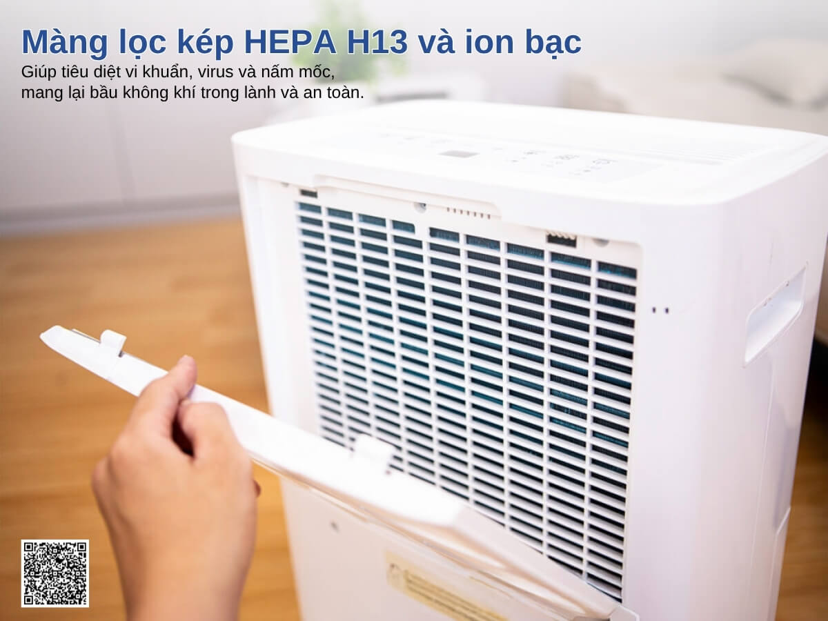 Màng lọc kép HEPA H13 và ion bạc diệt khuẩn hiệu quả