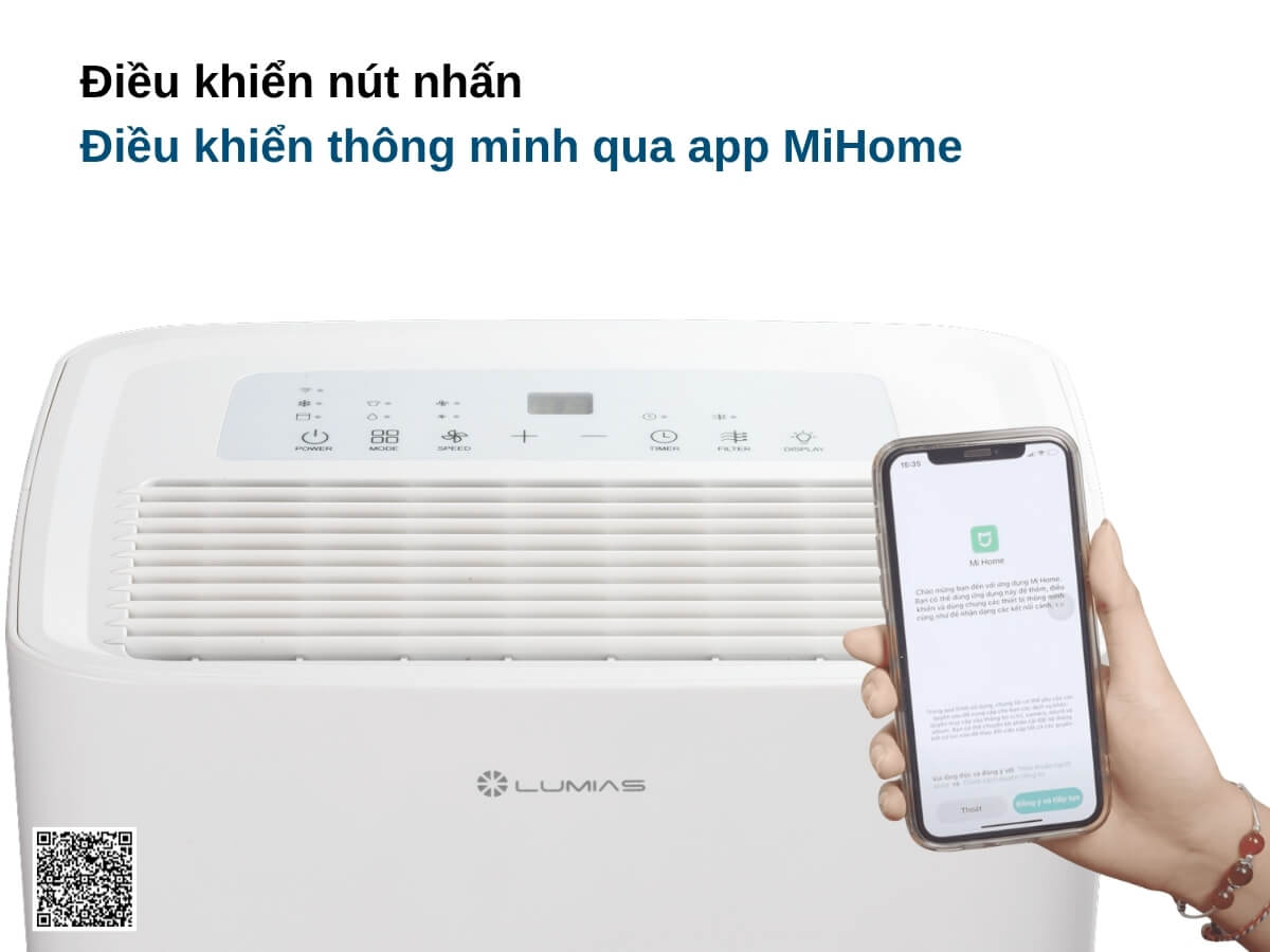 Máy hút ẩm và lọc không khí Lumias D6S-60L hỗ trợ điều khiển trực tiếp bằng nút nhấn trên thân và kết nối ứng dụng MiHome trên điện thoại, giúp người dùng bật/tắt máy, theo dõi độ ẩm, chọn chế độ hoạt động và hẹn giờ tới 12 tiếng từ xa. Màn hình LED hiển thị thông số rõ ràng, giúp thao tác nhanh chóng và tiện lợi.