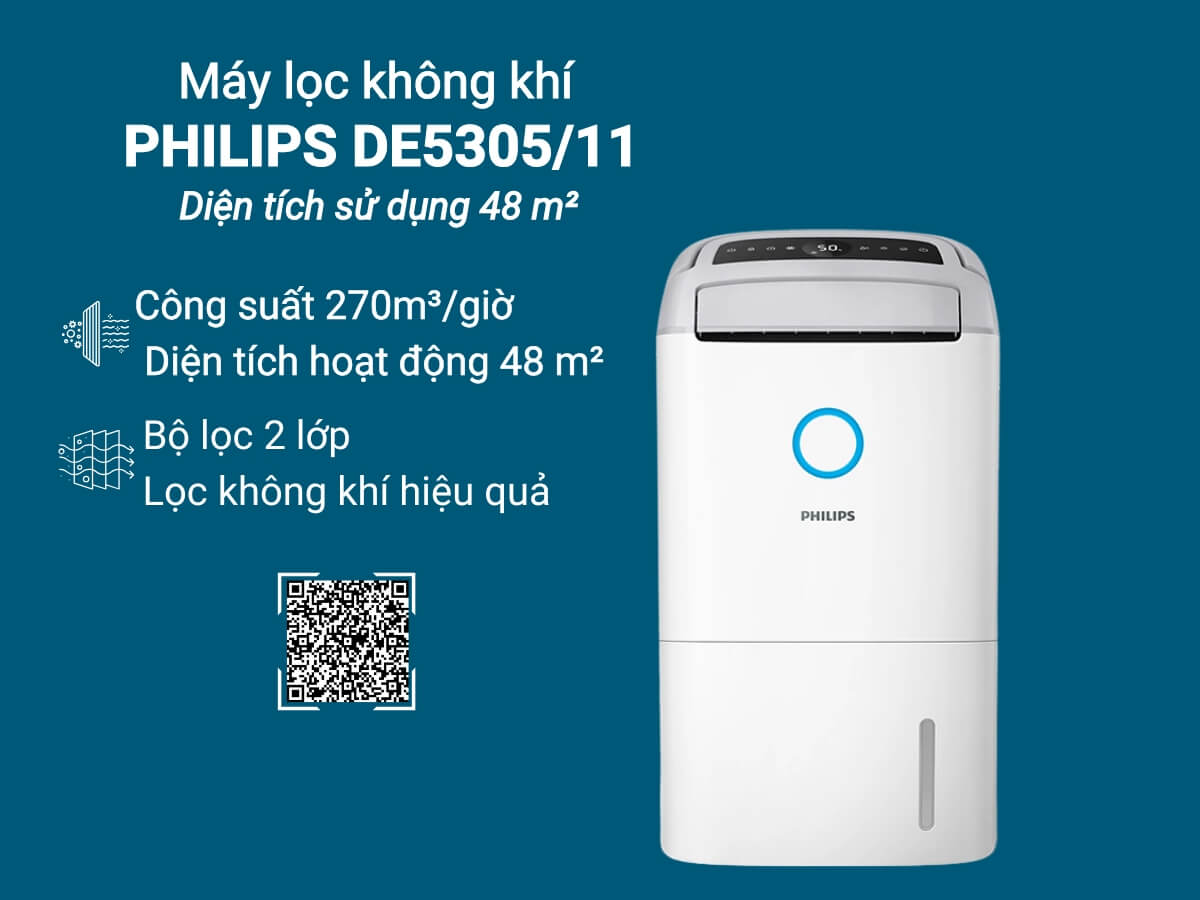 Máy hút ẩm và lọc không khí Philips DE5305/11 nổi bật với chức năng kép toàn diện, vừa duy trì độ ẩm lý tưởng, vừa loại bỏ hiệu quả các chất gây ô nhiễm, nấm mốc, vi khuẩn và vi-rút trong không khí. Máy sở hữu công suất hút ẩm mạnh mẽ lên đến 26.5 lít/ngày và khả năng lọc không khí 270m³/giờ (CADR). Nhờ bộ lọc HEPA NanoProtect, thiết bị có thể loại bỏ đến 99.97% các hạt bụi siêu mịn nhỏ đến 0.003 micron, mang đến bầu không khí trong lành, bảo vệ sức khoẻ gia đình.
