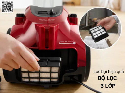 Máy hút bụi Bosch BGC05AAA2 trang bị bộ lọc 3 lớp với màng lọc HEPA H12 có khả năng lọc hiệu quả 99% các hạt bụi mịn, vi khuẩn, lông thú cưng, phấn hoa và chất gây ô nhiễm… giảm thiểu tối đa lượng bụi cũng như các tác nhân gây dị ứng trong không khí, bảo vệ sức khỏe cho cả gia đình.