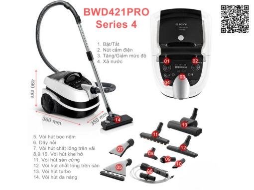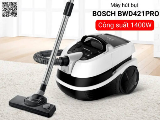 Máy hút bụi Bosch BWD421PRO được trang bị công nghệ AquaWash&Clean hiện đại, máy có khả năng hút bụi khô và chất lỏng, hỗ trợ làm sạch toàn diện trên các loại sàn cứng, thảm và đồ nội thất.