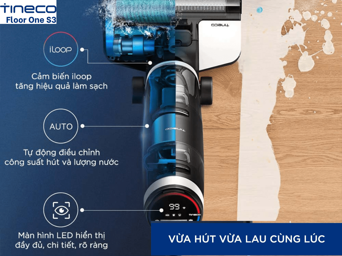 Máy hút bụi lau nhà Tineco Floor One S3 có thể thực hiện cả 2 công việc hút bụi và lau sàn trong cùng một lúc vô cùng tiện lợi. Đối với bụi bẩn, các mảnh rác vụn, tóc hay lông thú cưng… máy sẽ nhanh chóng hút sạch bằng lực hút mạnh mẽ của động cơ. Và những vết bẩn ướt, chất lỏng trên sàn nhà cũng sẽ được hút sạch, lau khô. Sàn nhà của bạn sẽ được làm sạch một cách toàn diện, nhanh chóng và hiệu quả, cho không gian sống sạch sẽ và góp phần bảo vệ sức khỏe cho cả gia đình.