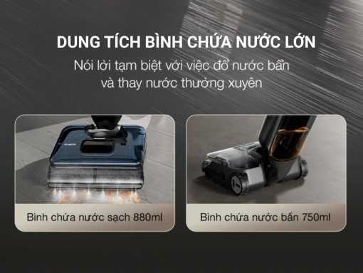 Máy hút bụi lau nhà Tineco Floor One S9 Artist Steam trang bị bình chứa nước sạch và bẩn riêng biệt. Bình chứa nước sạch dung tích 0.88 lít và bình chứa nước bẩn dung tích 0.75 lít. Với các mức dung tích này, bạn có thể sử dụng để làm sạch cho cả ngôi nhà mà không cần phải thêm nước hay đổ nước thường xuyên.