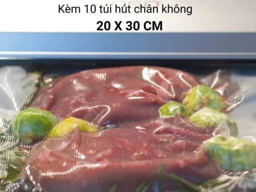 – Kèm 10 túi hút chân không 20 x 30 cm, chất liệu cao cấp, an có thể dùng trong lò vi sóng.