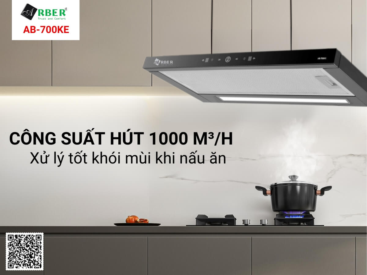 Máy hút mùi Arber AB-700KE được trang bị động cơ mạnh mẽ với công suất motor 170W, đảm bảo hiệu suất cao và hoạt động bền bỉ. Máy tạo ra công suất hút 1000 m³/h. Đây được xem là một mức công suất hút khá ấn tượng đối với dòng máy hút mùi bán âm, cho hiệu quả hút nhanh và sạch mọi mùi nấu nướng khó chịu. Từ những mùi nhẹ đến mùi chiên xào nặng mùi, lượng hơi nước, hơi nóng nhiều đều được máy xử lý nhanh chóng để trả lại không gian nấu nướng trong lành, sạch mát.