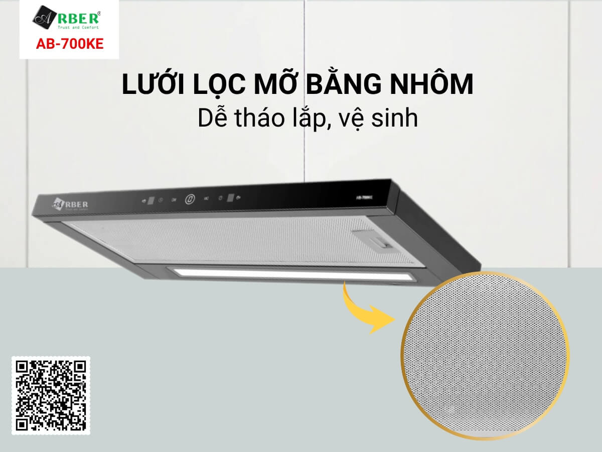 Máy hút mùi Arber AB-700KE trang bị 2 tấm lưới lọc mỡ bằng hợp kim nhôm kết cấu nhiều lớp, độ bền cao, khả năng chịu nhiệt, chịu hơi nóng tốt và đặc biệt là ngăn tối đa dầu mỡ bám sâu vào bên trong máy.