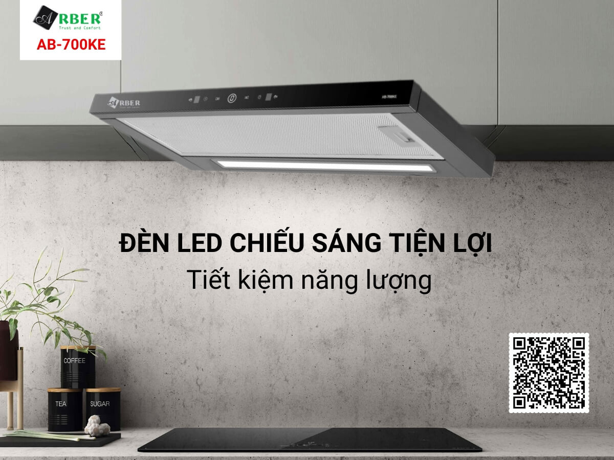 Máy hút mùi Arber AB-700KE còn thiết kế 1 đèn LED thanh ở mặt dưới máy, có chức năng cung cấp ánh sáng cho bếp nấu phía dưới. Đèn LED này tiết kiệm điện và cung cấp lượng ánh sáng vừa phải, đủ để chiếu sáng nhưng không gây chói mắt, giúp quá trình nấu nướng thuận tiện hơn. Đặc biệt là trong điều kiện thiếu sáng hay nấu ăn vào đêm muộn thì đèn LED này rất hữu ích.