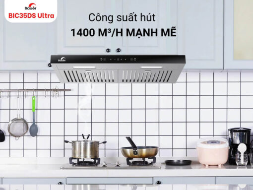 Máy hút mùi Bauer BIC35DS Ultra trang bị động cơ làm việc mạnh mẽ, tạo ra công suất lớn đến 1400 m³/h. Đây là một mức công suất ấn tượng trên dòng máy hút mùi, đem đến khả năng hút khói, khử mùi nhanh chóng và hiệu quả, loại bỏ được các mùi dầu mỡ, mùi thức ăn, hơi nóng, hơi nước… trong quá trình nấu nướng, nhanh chóng trả lại không khí trong lành, sạch thoáng cho không gian bếp.