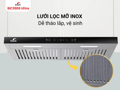 Máy hút mùi Bauer BIC35DS Ultra trang bị tấm lưới lọc mỡ được làm bằng chất liệu inox có độ bền cao, thiết kế dễ tháo lắp, đảm bảo thuận tiện cho việc vệ sinh, lau chùi lưới, hạn chế gỉ sét cũng như tăng thêm thẩm mỹ cho máy.