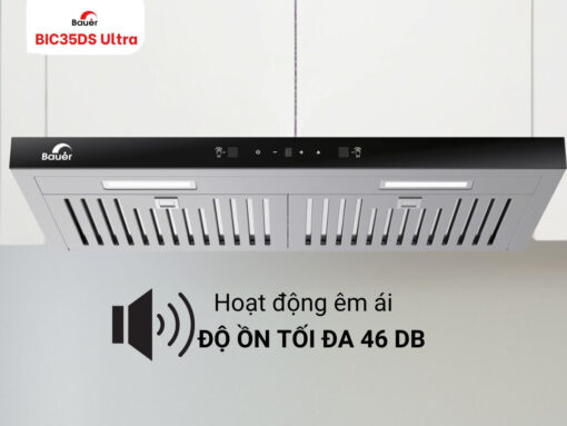 Máy hút mùi Bauer BIC35DS Ultra hoạt động với công suất mạnh mẽ, khả năng hút khói khử mùi hiệu quả, song máy vận hành khá êm ái và yên tĩnh, không gây tiếng ồn lớn ảnh hưởng đến không gian sinh hoạt của gia đình. Độ ồn tối đa của máy ở mức 46 dB, giữ cho không gian bếp được yên tĩnh và dễ chịu khi máy làm việc.