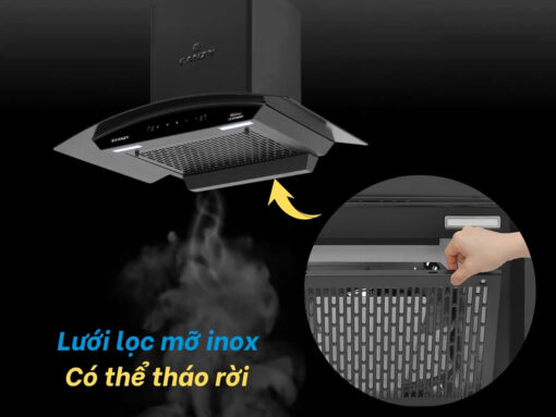 Với thiết kế kính cong và kích thước ngang 70cm, máy hút mùi này phù hợp với những gian bếp có không gian rộng rãi, thoải mái.