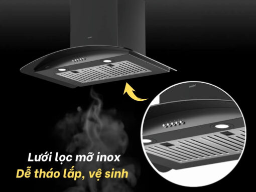 Máy hút mùi Comfee CH-70CV71B được thiết kế theo phong cách gắn tường kính cong tối giản nhưng không kém phần hiện đại, sang trọng. Thân máy inox sơn tĩnh điện màu đen, chống gỉ cùng kính cong cường lực tăng thêm thẩm mỹ cho không gian bếp.