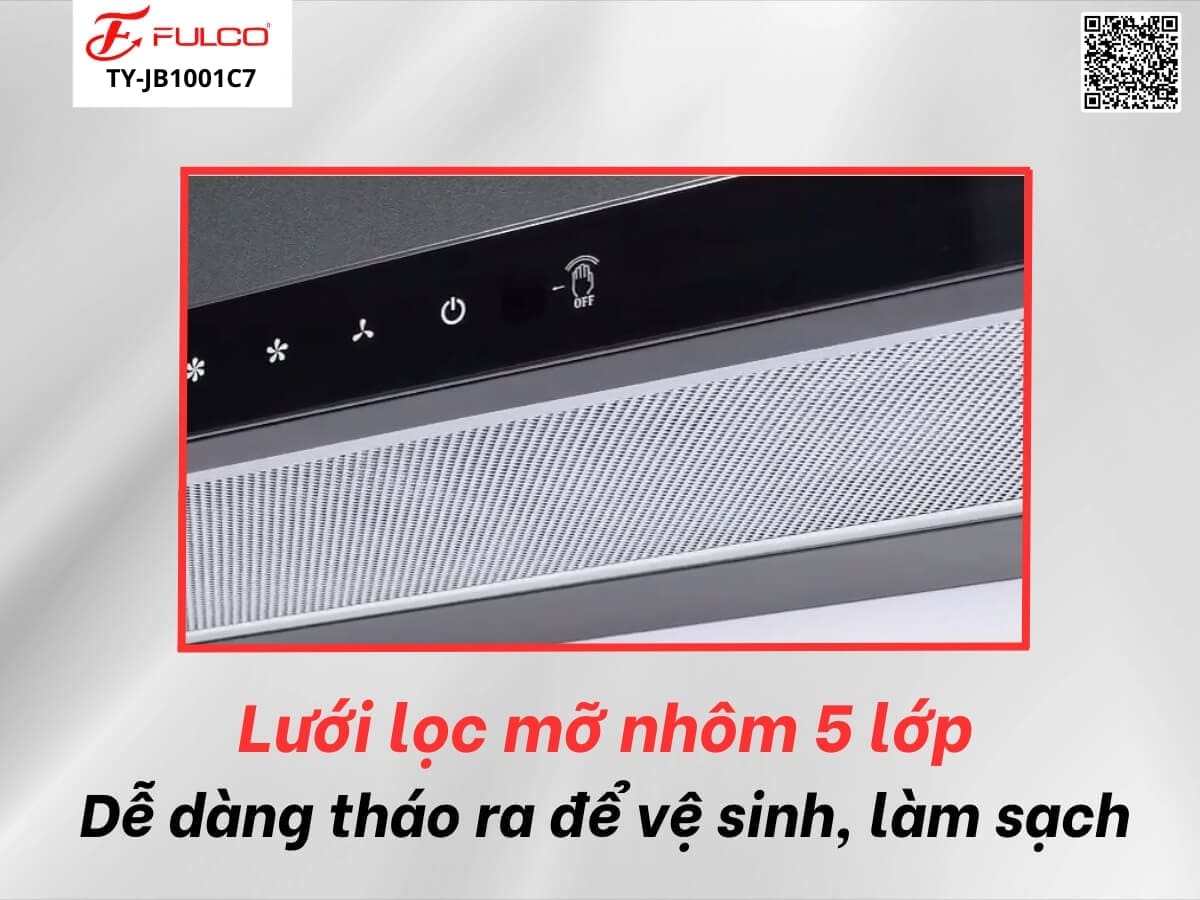 Máy hút mùi Fulco TY-JB1001C7 trang bị hệ thống lưới lọc mỡ bao gồm 2 tấm lưới lọc, chất liệu nhôm cao cấp, cấu tạo 5 lớp giúp ngăn tối đa dầu mỡ bám sâu vào bên trong máy. Lưới lọc cũng được thiết kế dễ dàng tháo lắp giúp bạn dễ dàng tháo ra để vệ sinh, làm sạch.