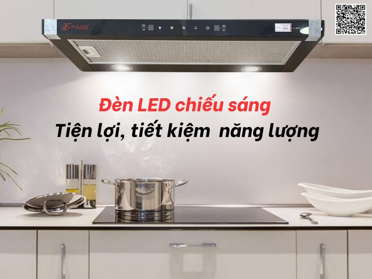 Máy hút mùi Fulco TY-JB1001C7 còn thiết kế 2 đèn LED 2 x 2W ở mặt dưới máy, có chức năng cung cấp ánh sáng cho bếp nấu phía dưới. Đèn LED này tiết kiệm điện và cung cấp lượng ánh sáng vừa phải, đủ để chiếu sáng nhưng không gây chói mắt, giúp quá trình nấu nướng thuận tiện hơn. Đặc biệt là trong điều kiện thiếu sáng hay nấu ăn vào đêm muộn thì đèn LED này rất hữu ích.