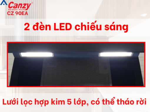 Với 2 đèn LED (1.5W mỗi bóng đèn), hệ thống đèn chiếu sáng của máy hút mùi Canzy CZ 90EA giúp chiếu sáng khu vực nấu nướng mà không cần phụ thuộc vào đèn bên ngoài.