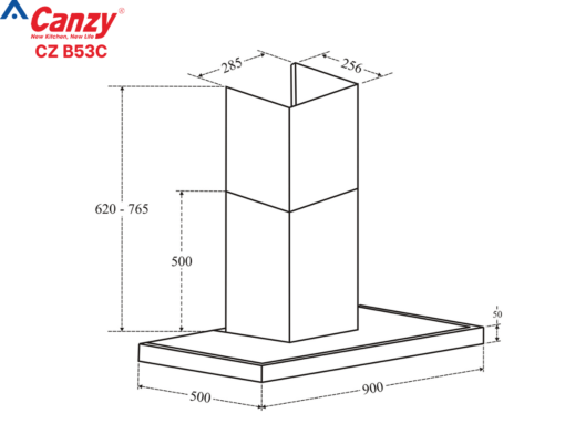 Chiều ngang 90cm của máy hút mùi Canzy CZ B53C phù hợp với các không gian bếp rộng rãi, không bị giới hạn về chiều ngang.