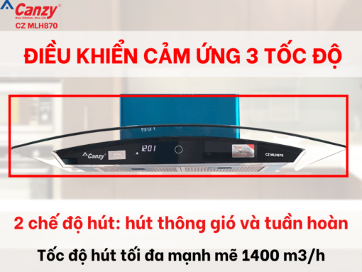 Máy hút mùi Canzy CZ MLH870 có bảng điều khiển cảm ứng vô cùng linh hoạt và tiện lợi cho người dùng. Với 3 tốc độ hút khác nhau, phù hợp với lượng mùi và khói của nhiều loại món ăn, đảm bảo căn bếp của bạn sẽ luôn sạch sẽ và thoáng mát.