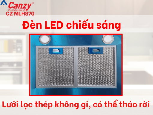 Máy hút mùi Canzy CZ MLH870 được thiết kế với tấm lưới lọc mỡ bằng thép không gỉ có vai trò ngăn chặn các lớp dầu mỡ, bụi bẩn lọt vào trong máy, giúp hút mùi tốt hơn và tránh làm giảm đi tuổi thọ của máy. Ngoài ra, chị em nội trợ có thể vệ sinh một cách dễ dàng bằng cách tháo ra, dùng chất tẩy rửa chuyên dụng hoặc làm sạch bằng máy rửa bát.