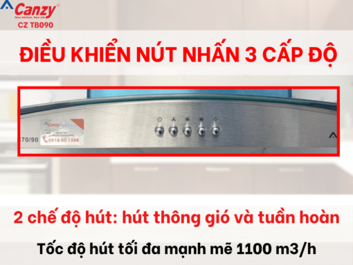 Máy hút mùi Canzy CZ TB90 sử dụng nút điều khiển với 3 tốc độ hút để điều chỉnh lượng tốc độ dựa theo lượng mùi và khói trong quá trình nấu nướng giúp căn bếp luôn sạch mùi.