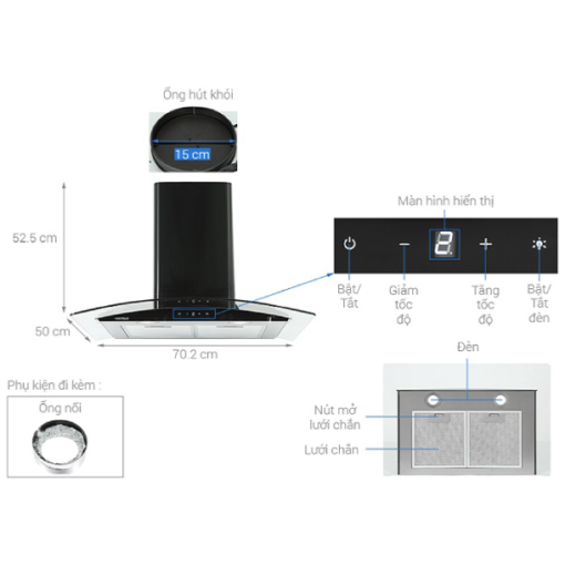 • Hút đẩy trực tiếp bằng ống dẫn khí phù hợp với các không gian bếp lớn.